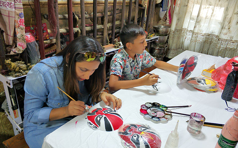 Ms. Shan and her son are learning to paint facial masks in the Peking Opera at Hutong courtyard!