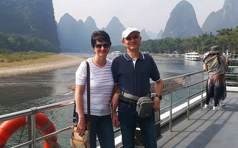 Mr. Laszlo Virag and Mrs. Judit Virag enjoy the Li River Cruise alone with the fascinating karst landscapes of Guilin!