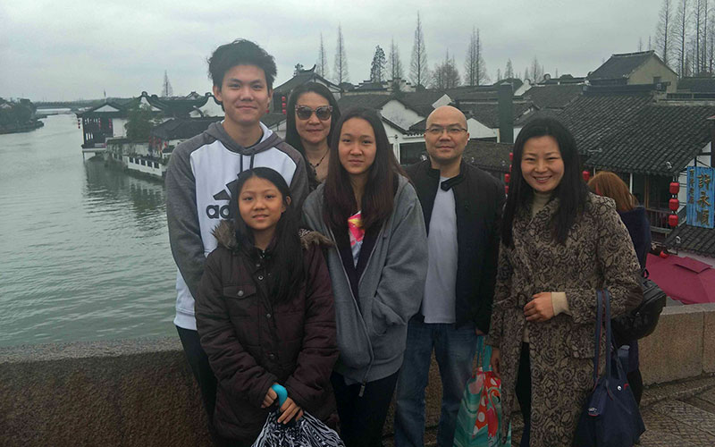 Mrs. Janty Wirjadi's family explore Zhujiajiao Water Town accompanied by their guide Mulan!
