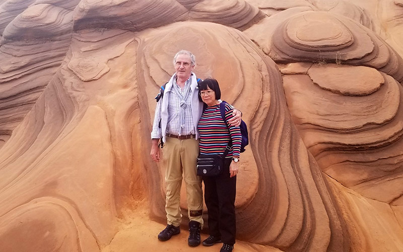 Mr. Wehrle and his wife standing on the curves of the Wave Valley in Jingbian.